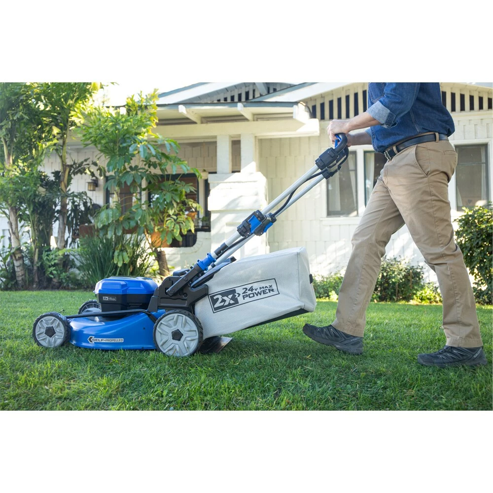 The Kobalt 2x24V (48 Total Volts) Brushless Motor Self Propelled Lawn Mower provides superior performance without the noise, mess, and fumes of gas. The 2x24V=48 Total Volts mower offers versatility with 3-1 cutting modes along convenient push button start. Offering up to 60-minutes of cut time, the 2x24V mower has you covered. The included batteries and charger are compatible with all Kobalt 24-volt max tools and are backed by a 5-year warranty on the mower and a 3-year warranty on the batteries and charger.