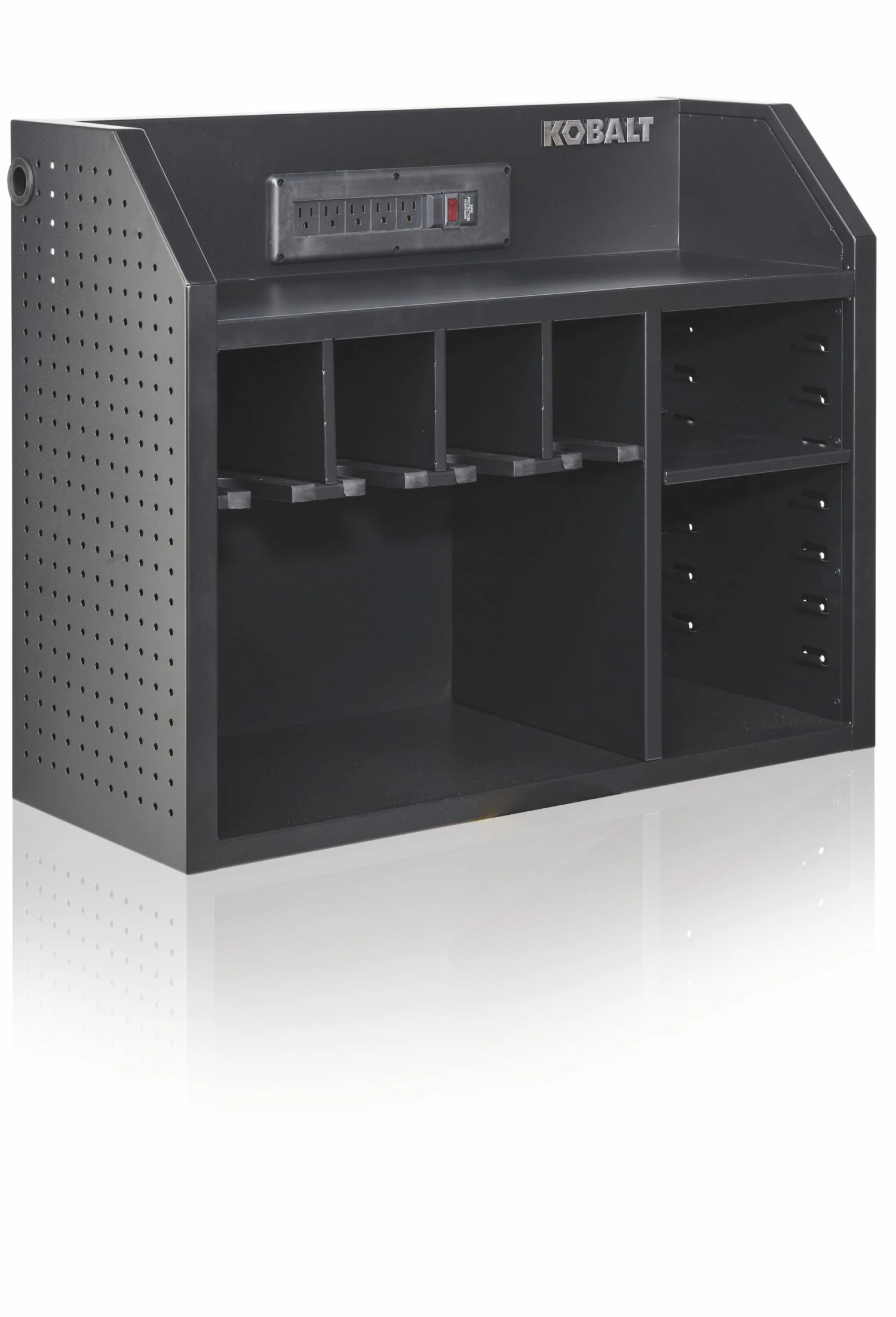 - Vertical hanging space for drills and flashlights, plus flex space with adjustable shelves